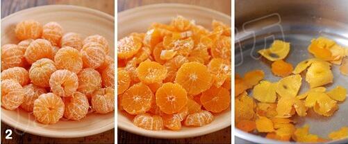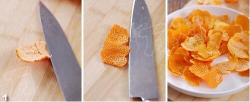 1.橘子剥皮,把外皮朝下,白色一面朝上,用刀慢慢去掉白色部分不要。大约用700g桔子的1/4果皮即可。皮太多了做出的酱就会过于苦了
