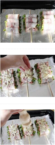 5.将串好的培根串放入烤盘,下面垫上一张锡纸。这样不仅可以控制温度,保持培根中的水分,还好收拾,做完之后把锡纸扔掉就可以了,不用费劲的刷烤盘了。放入烤箱160º烤5分钟。