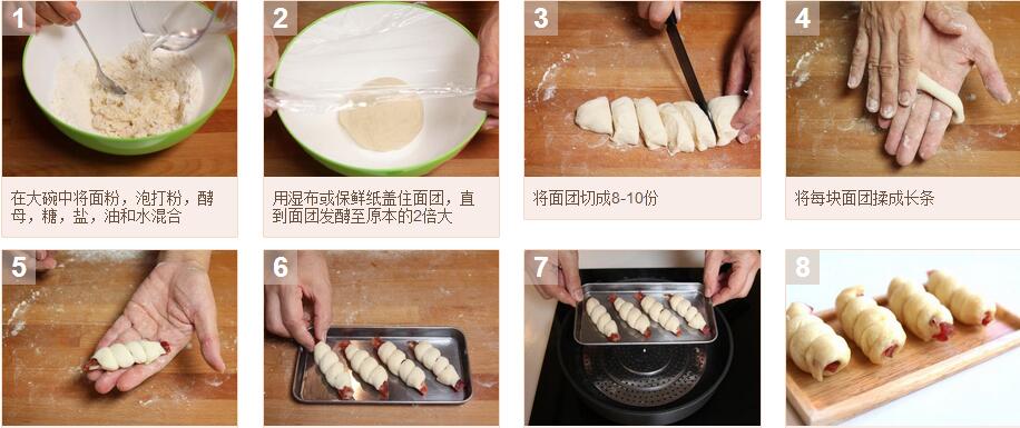 自制腊肠卷的材料:腊肠2根,面粉180克,酵母1.5茶匙,泡打粉1茶匙,油1汤匙,糖2汤匙,盐3克,水115mL