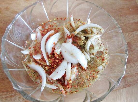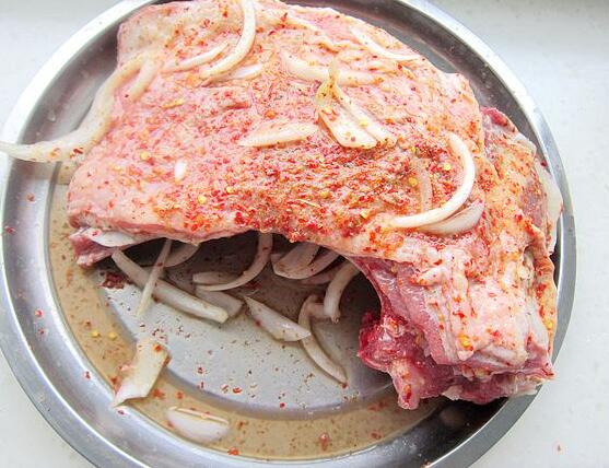 1.把羊排切好要的份量去边边,用叉子把羊排扎上好多小孔,把洋葱去皮切丝,把洋葱丝辣椒粉孜然粉胡椒粉盐加少许水一起拌均匀