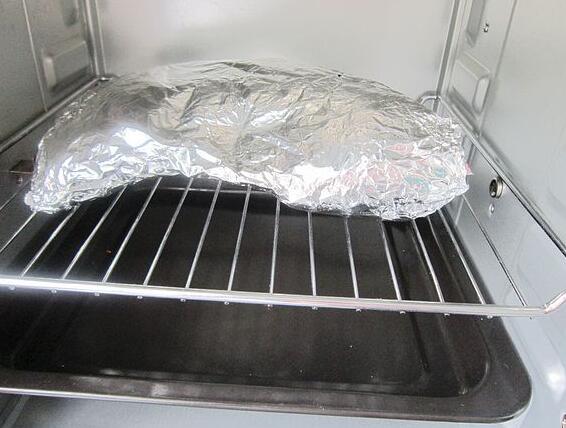 3.烤羊排之前,把腌制的羊排提前拿出一小时,把烤箱200°用上下功能预热5分钟,把腌制好的羊排和洋葱块一起用锡箔纸包好,将锡箔纸四周包严,放在烤架上,用200°度先烘烤50分钟。