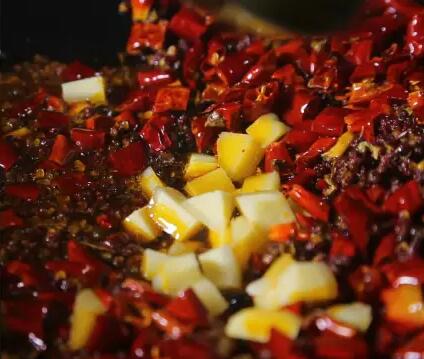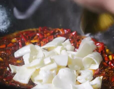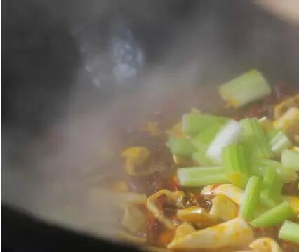 3.坐空锅,加入红油、干辣椒、花椒、姜、蒜、香辣酱、啤酒炒香后下入黄喉,翻炒均匀,最后放入,西芹、洋葱、葱段,爆香起锅即可。