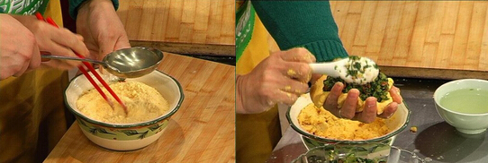 京东菜饽饽的材料:玉米面,白菜,五花肉,料酒,生抽,盐,黄酱,葱姜蒜末,鸡精,香油 京东菜饽饽的做法:1.小白菜焯水切碎备用,美食网 2.坐锅,放入切好的五花肉丁翻炒至有点发干时放入料酒,生抽,盐,黄酱翻炒均匀后与白菜碎混合,加入葱姜蒜末,鸡精,香油搅拌均匀备用,3.温水和面,和好后将调好的馅料放入面片中,慢慢团成圆形,然后放入平锅中压扁,放入一勺水,盖盖儿焖五分钟,待一面煎上色后翻到另一面,再加入一勺水,直到煎至金黄后即可出锅