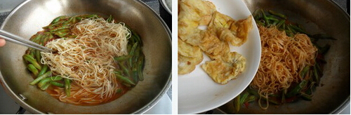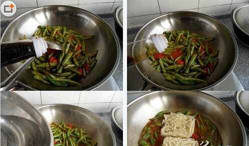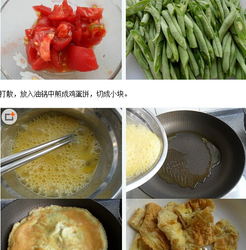 豇豆鸡丝西红柿焖面的材料:西红柿、长豆角、鸡蛋、面条,食用油、酱油、盐、鸡粉 豇豆鸡丝西红柿焖面的做法: 1、西红柿去皮后切成小块、长豆角摘洗干净后斜着切成段。 2、鸡蛋打散,放入油锅中煎成鸡蛋饼,切成小块。 3、炒锅热油,放入西红柿块煸炒出汤汁,然后放入豆角段炒至断生。 4、倒入酱油,少许的清水,放入面条。 5、把面条用筷子扒拉散开,盖上锅盖用小火慢慢的焖至快熟时,放入鸡蛋,拌匀出锅。