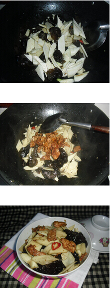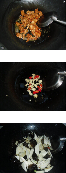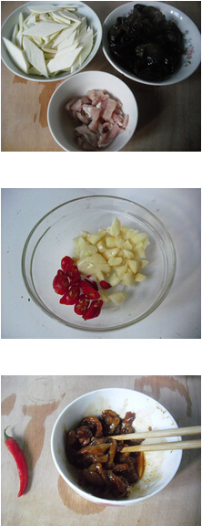 黑木耳茭白炒肉的材料:茭白,黑木耳,瘦肉,蒜,小红椒,酱油,生粉,料酒,鸡精,油盐 美食网 黑木耳茭白炒肉的做法: 1 茭白洗净削去老皮切斜片,黑木耳泡好洗净,瘦肉切片. 2 小红椒蒜切小粒. 3 肉片加酱油料酒生粉腌渍. 的做法 4 热锅冷油下肉片炒熟铲出. 5 下红椒,蒜爆香. 6 放入茭白,木耳煸炒. 7 放入肉片-起炒均加鸡精调味,装碗即成.
