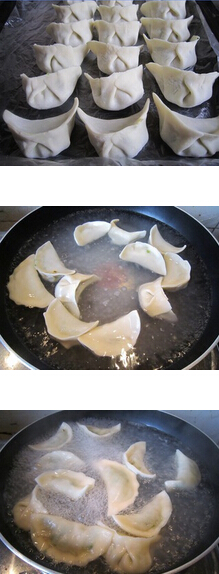 6 取适量馅放在饺子皮中,手指粘水,在饺子周围抹上水。