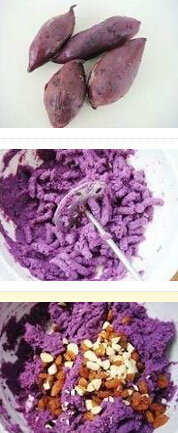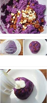 1.紫薯洗净放锅里蒸10分钟,去皮,切小块,紫薯里加炼奶和蜂蜜捣成泥,干果切碎,把碎干果和葡萄干放紫薯泥里搅拌均匀 怎么做好吃