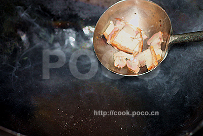 1、豆腐切块;火腩:粤菜中的一种烧腊制品,是用腌料把猪五花肉腌渍入味,然后烧烤而成。是猪肋骨前后的部份,皮脆、肥廋相间又不太咸,切片待用;彩椒切片;