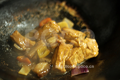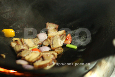 4、另置空锅,爆香姜、蒜、彩椒、洋葱,下虾酱1匙拌炒几下,加入烧肉同炒;