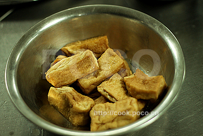 2、锅中下油烧热,豆腐一片片放入,偶尔摇动炒锅,约4、5分钟炸至变金黄色,捞起滤油。(也可直接购买市场的炸豆腐代替,外面金黄,内里白嫩)