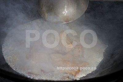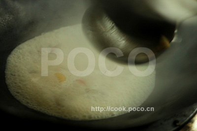 6、鸡汤煮开后下豆腐块,烹入蚝油1匙、盐糖少许调味;