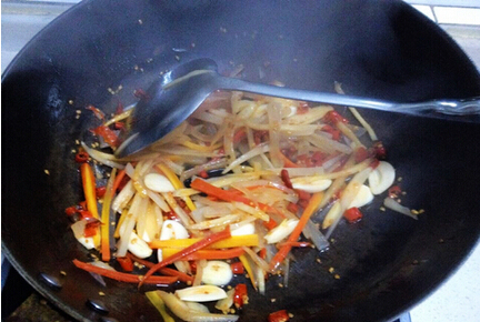 2、烧二两油,放入泡椒泡姜炒出香味,放入蒜片和泡菜一起稍炒,加料酒后添入鲜汤或水,再加入少量糖、胡椒粉,适量加入盐。