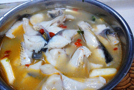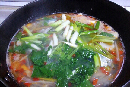 4、加入鱼排和鱼片、葱段,鱼七八成熟后即可连汤带鱼倒入配菜做底的盆内。