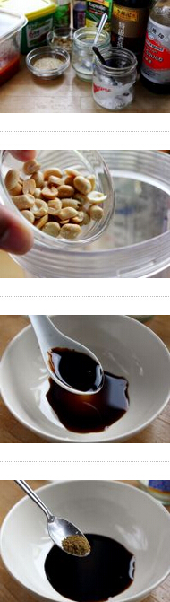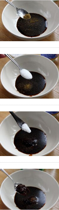 1.备好自制番茄酱、黄豆酱、芝麻、花生、五香粉、孜然粉、油、盐、糖、老抽和生抽。