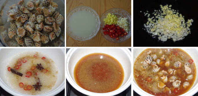 辣酒煮花螺的材料:花螺500g、姜、蒜、鲜红椒、葱、八角、桂皮、鱼露、盐、生抽、胡椒粉、生抽、甜酒汁、白酒、陈醋
