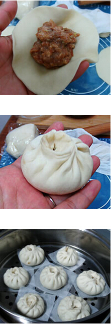 2.发酵好的面团取出,揉匀,分成小块,这点包子皮分量我做了16个包子,把每小块面团揉圆,擀成中间厚四周薄的圆形面片,包入肉馅,右手拇指,食指捏住面皮边沿打褶,直至收口捏拢封口。