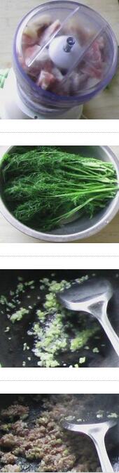 3. 把肉馅分成两份,锅内入少许油,下入姜蒜炒香,把其中一半肉放入炒至变色,炒好的肉跟另一半肉混合在一起。放入葱,盐,十三香,加入茴香拌匀,馅就做好了