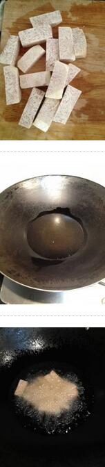 返沙芋头的材料:香芋300克,白糖110克,水70克,油返沙芋头的做法:1. 芋头去皮,切成大拇指粗的块。怎么做好吃 2. 坐锅倒油烧到七成热,香芋放入油锅里炸。炸到表面微黄,捞起滤油。3. 锅子洗净,白糖和水放入锅里,用小火熬制,开始冒大泡,再煮一会儿,会变成小泡,水份也减少了,这时倒入炸好的香芋,关火,然后快速翻炒,炒至芋头表面的糖都凝固即可。