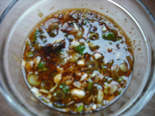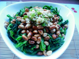 9 上桌前倒入调好的料汁,一盘香辣、甜、酸适口的菠菜拌花生米一会功夫就落入我们一家三口的腹中。