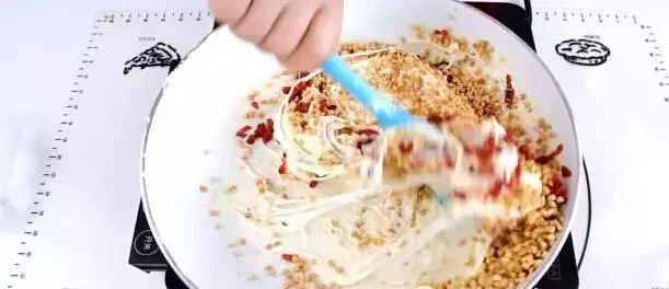 蔓越莓牛轧糖的材料:原味棉花糖100克,大杏仁60克,奶粉50克,蔓越莓40克, 蔓越莓牛轧糖的做法: 1、大杏仁切碎;蔓越莓切碎; 2、棉花糖放入料理盆内,隔水加热至溶化,取出料理盆,趁热加入奶粉,快速搅拌,加入大杏仁和蔓越莓碎搅拌均匀,如果棉花糖变硬可再加热变软后搅拌 家常菜谱 3、将拌好的糖糊装入保鲜袋内,放入冰箱冷藏至糖糊变硬; 4、取出变硬的糖饼滚上一层奶粉或者糖粉;切成条即可食用,若做的多可以用糖纸包装存放。