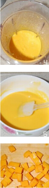 5.淡奶加细砂糖打发至6,7分发(芒果本身有甜度,糖的量可以自由调节),打发的淡奶和芒果酱混合均匀即成慕斯糊,芒果丁到入慕斯糊拌匀