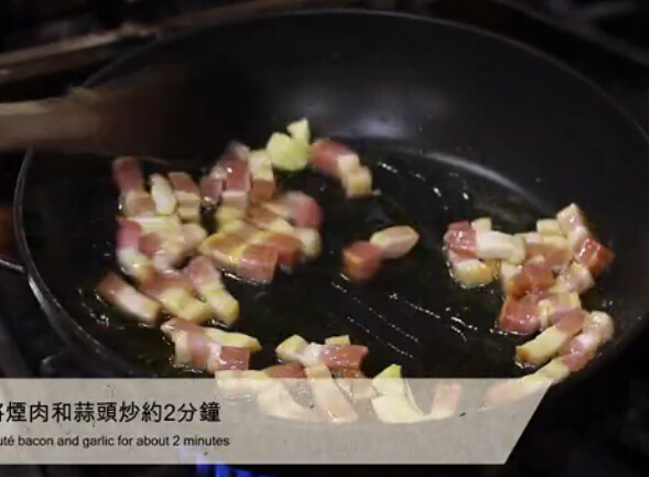 1. 白锅煎香培根,慢慢有油份渗出,煎至焦黄后切片备用