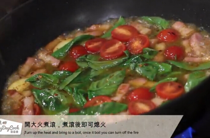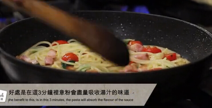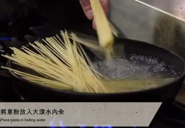 3. 将煮至7成熟的PENNE(意粉)用橄榄油稍伴一下后倒入锅中,加入香草等调味即可。