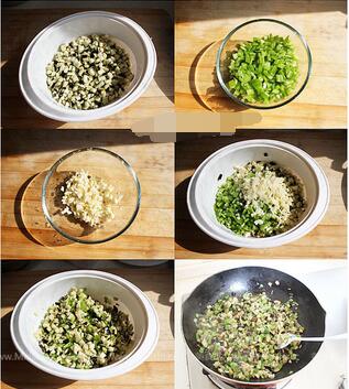 2.茄子丁、尖椒碎、蒜末混合加盐、白糖、生抽和一大匙花生油拌匀,将拌匀的馅料用平底锅小火炒至茄子变软怎么做好吃