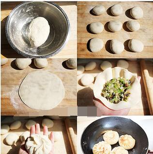 3.取一份擀成圆饼,将两大匙馅料放在中间,包成包子状即可