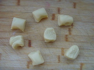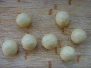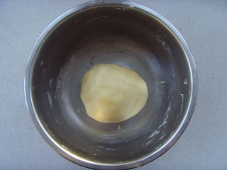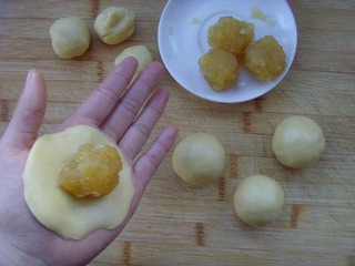 13 取一份按扁,包入凤梨馅,用手掌搓圆,朝下放置。