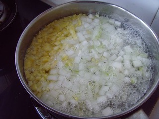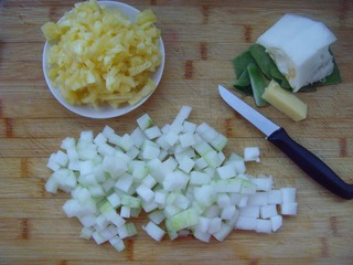 1 菠萝去皮去芯,用淡盐水浸泡半小时之后沥水切成小块;冬瓜去皮去籽,切成小块。