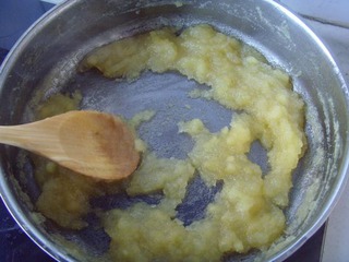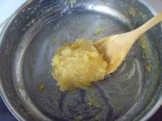 5 取3/4份的果料用料理机打成蓉状,倒回锅中小火慢慢翻炒。