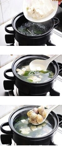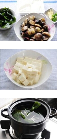 蛤蜊海带豆腐汤的材料:海带,豆腐,蛤蜊,葱花,姜丝,盐,胡椒粉, 蛤蜊海带豆腐汤的做法: 1.蛤蜊泡在清水中,加一小勺盐,滴几滴食用油,养上半天让蛤蜊吐出泥沙,洗净捞出 2.海带结冲洗干净在清水里泡会儿,豆腐切块 3.锅中注入清水,放入少许姜丝,把海带结放入煮开后转小火煮10分钟 4.将豆腐放入锅中和海带一起小火煮两三分钟,蛤蜊放入锅中,煮至开口,放盐和胡椒粉调味,撒葱花出锅即可
