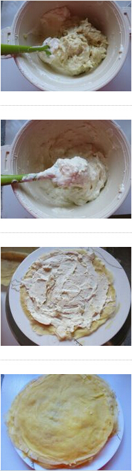 6.取一个大些的平盘,最底层放上两张饼皮,抹上一层榴莲奶油馅,再放上一张饼皮,以此法操作一直到完成所有的材料,蛋糕就做好了。