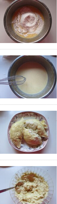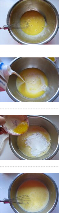 1.首先将鸡蛋打散,加入牛奶,糖粉、融化的黄油,搅拌均匀,筛入低筋面粉用,手动打蛋器搅匀看到没有没有干粉颗粒就可以了,放冰箱冷藏30分钟。