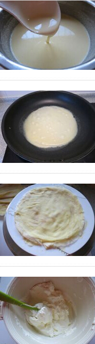 4.不粘锅用小火加热,舀一勺面糊放在锅里端起锅顺势转一圈,摊成一个蛋饼,鼓泡就可以起锅取出了,放在干净的盘子里。全部烙好的饼皮放在冰箱或者其他凉爽的地方降温待用。
