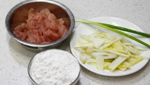 苦笋滑肉汤的材料:里脊肉300克,苦笋150克,红苕粉300克,清水,盐,味精,鸡精,葱花