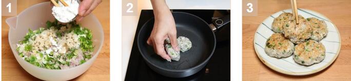 2. 用手将原理做成鱼饼的样子。然后放入油镬内以中火煎6-7分钟(每面约煎4分钟),直到双面微焦而变得香脆盛出。