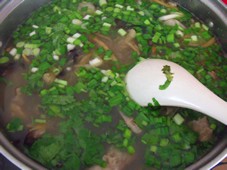 传统的做法,其实就是很简单,炖的久,所以膻味都没了。只有浓浓的鲜香。汤炖好后,加黄花菜和木耳丝,还有自家做的红薯粉。最后来点嫩的蒜苗和香菜,淋上红亮亮的辣椒油,红白黄黑红,煞是好看。”