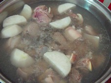 1 冷水放羊肉萝卜,一起烧开煮一会,到很多脏末出来,捞出羊肉洗净,萝卜丢掉。