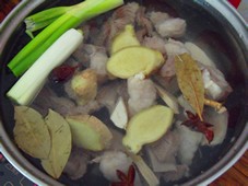 2 羊肉和香料一起炖到汤汁发白,我炖了五个小时,冷却,捞出的羊油,用来烫辣椒油,可真棒。