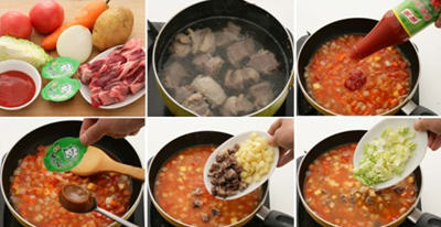 2. 洋葱、番茄、胡萝卜和土豆洗干净后切块,下锅煸炒,加入家乐番茄沙司和牛肉汤煮。