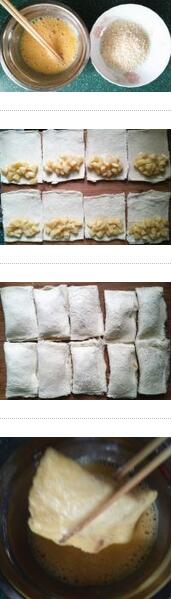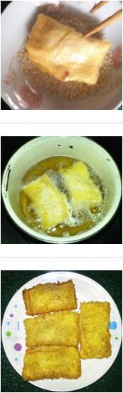 6.锅烧热,转中火,倒入适量色拉油,将过好面包糠的土司派下油锅炸制,两面金黄就可以出锅了