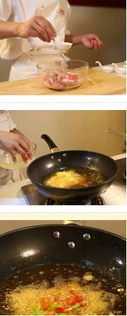 3.坐锅倒油大火烧至六七成热,下入腌好的鸭丁滑熟,捞出放入漏勺控油。