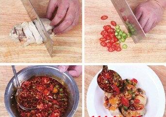4.把青尖椒、红尖椒去蒂、去籽,切成小粒,放在,大碗内,加人葱姜末、蒜蓉、酱油、精盐、花椒油、辣椒油、味精、豆瓣酱、豆鼓、白糖、米酷、香油和鸡清汤调洋均匀成味汁。