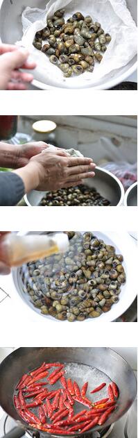 2.把田螺淘洗干净后倒入清水盆里,滴入少许香油,精盐养两天让其吐净肚内赃物。