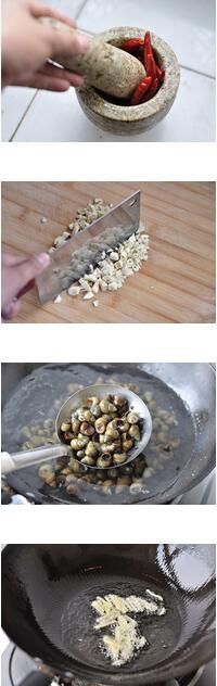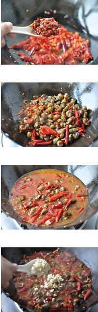 6.坐锅倒油,油热后放入姜丝爆香,倒入捣好的辣椒酱,炒香,放入一汤匙郫县红油豆瓣酱,炒香,再倒入控净水的田螺,大火翻炒,倒进没过田螺的清水,大火煮开后改小火煮至汤汁浓稠,倒入切好的蒜粒,翻炒均匀即可出锅。的做法