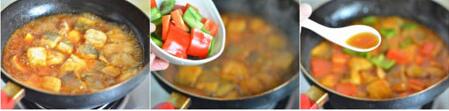 4.坐锅倒油,油6成热时将裹好生粉的鱼块放入,用中火煎至鱼块二面金黄,倒入调好碗汁,煮开后用小火炖10分钟左右。加入青红椒块再加1小勺香油拌匀后即可出锅。