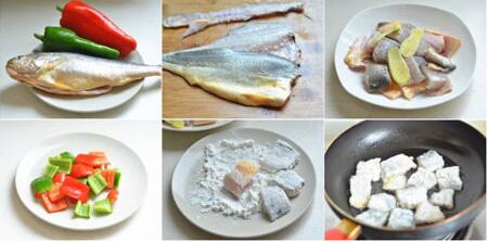 3.黄鱼去鳞后洗净控干,黄鱼去除鱼头,然后黄鱼横向片开,剔除鱼骨,鱼肉切成大小相同的块状,加盐,料酒,胡椒粉和姜片拌匀腌15分钟,腌好的鱼块放在生粉沾一层生粉。