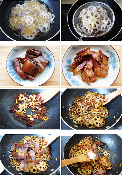 3.锅里油倒出,将切碎的豆瓣酱放入锅中,不断煸炒,炒出红油后,放入葱姜煸香,倒入炸好的莲藕片一起翻炒,再放入腊肉片翻炒,最后加入一勺白糖翻炒均匀,即可出锅装盘后撒少许芝麻或葱花装饰